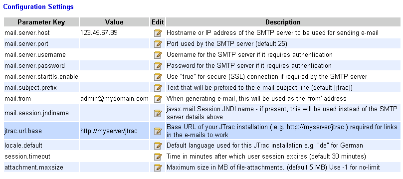 For e-mail notifications to work, an SMTP server needs to be configured in JTrac. Users who have the ADMIN role will be able to access the JTrac configuration settings screen from a link on the "OPTIONS" screen. Note that you will need to provide values for the "mail.from" and the "jtrac.url.base" properties also, for things like the hyperlinks within e-mail to work properly. JTrac also supports mail servers that require authentication or secure connections using SSL. You can refer the descriptions of the available configuration property settings available from the settings screen as shown below.
